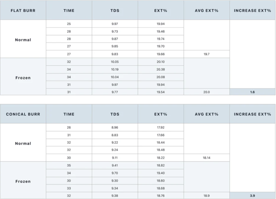 📊 У таблиці показано, що заморожені зерна при конічних жорнах дають стабільніший результат за показниками TDS і відсотка екстракції. Це підтверджує вплив температури та форми жорен на рівномірність помелу.
